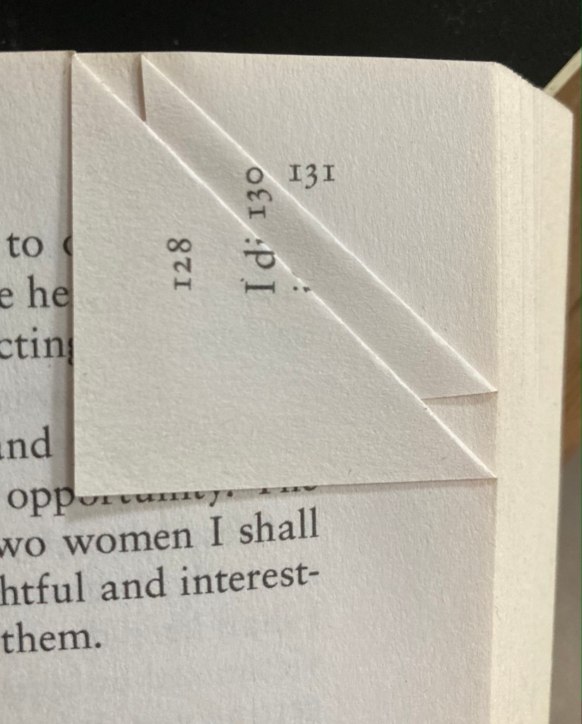 Reading with a purpose and marking a page in this way doesn’t count. Students, critics, or anyone perusing a text because they have to, may well fold quite a few page corners on the way. That’s different: in this mode, a reader is already actively looking out for quotes and signs, significance or resonances, relating to an essay, research or other work. So the surprise element is greatly reduced.