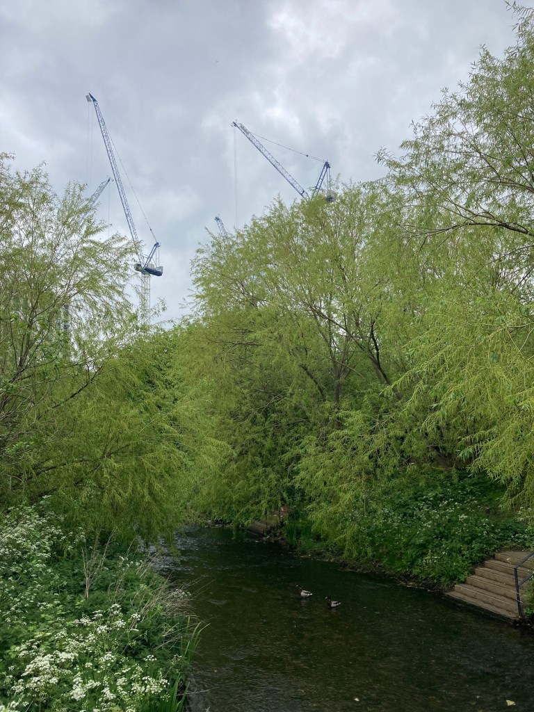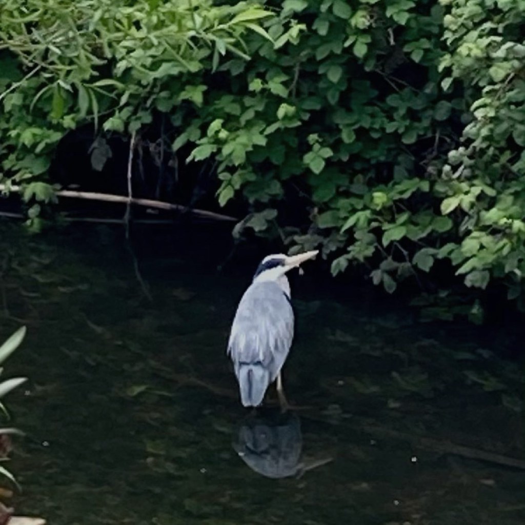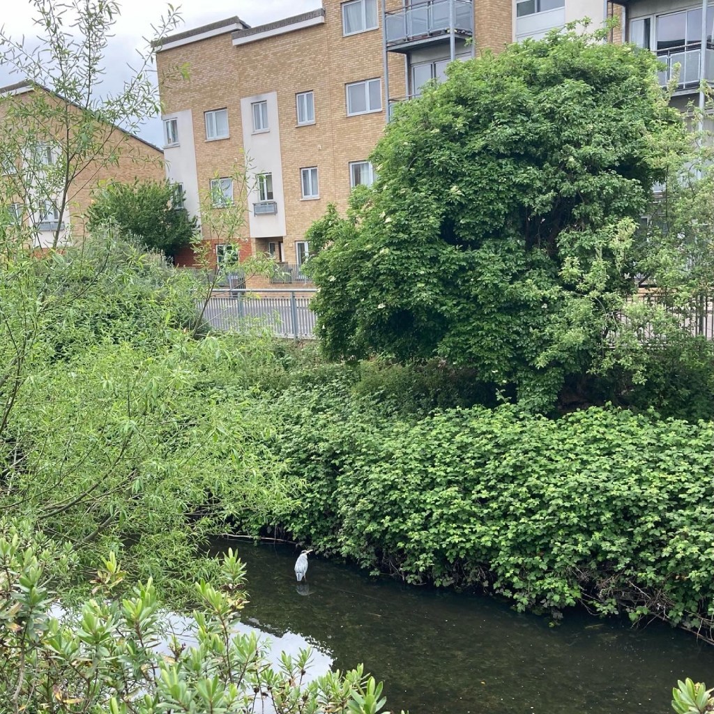 Perhaps, because the contrast seemed so stark here, at first, I found it hard to take in what I was seeing. I followed a footpath for a while – willow and alder carrs lining green banks of the river, ducks calling out, signs displaying the types of fish that might be found in this part of Lewisham (yes, also litter and temporary metal barriers, but still…) And then, mentally blinking in confusion – below the housing blocks of Waterway Avenue, waiting patiently for a meal, stood a heron. I stared, even turning to point it out to a woman struggling past with her shopping – ‘Look, a heron.’ She, nodded, half-smiling at this random male stranger gawping at urban river wildlife, then hurried on.