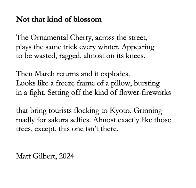 One way or another, eventually I’ll realise that although there may be something in that poem – a line, a central conceit worth saving – it isn’t working now. Then I’ll chip away again and try it out someplace else. Recently, after a poem about an ornamental cherry tree on my street was returned by yet another publication, I decided that I’d share it on social media instead – via Black Bough Poetry’s Top Tweet Tuesday platform on twitter.