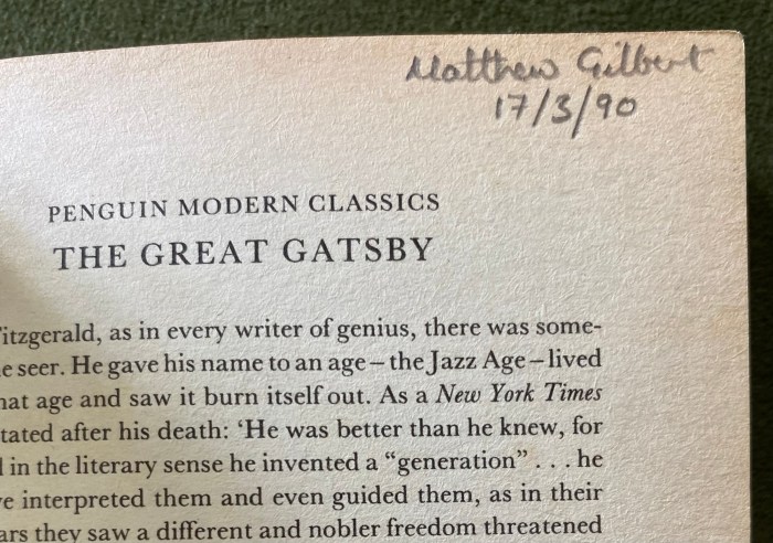 In 1990, young me, had marked the page, with the aforementioned ‘vast carelessness’ passage, [190 in my Penguin Modern Classics Edition] but not for that quote, back then I’d been taken with one on the facing page: